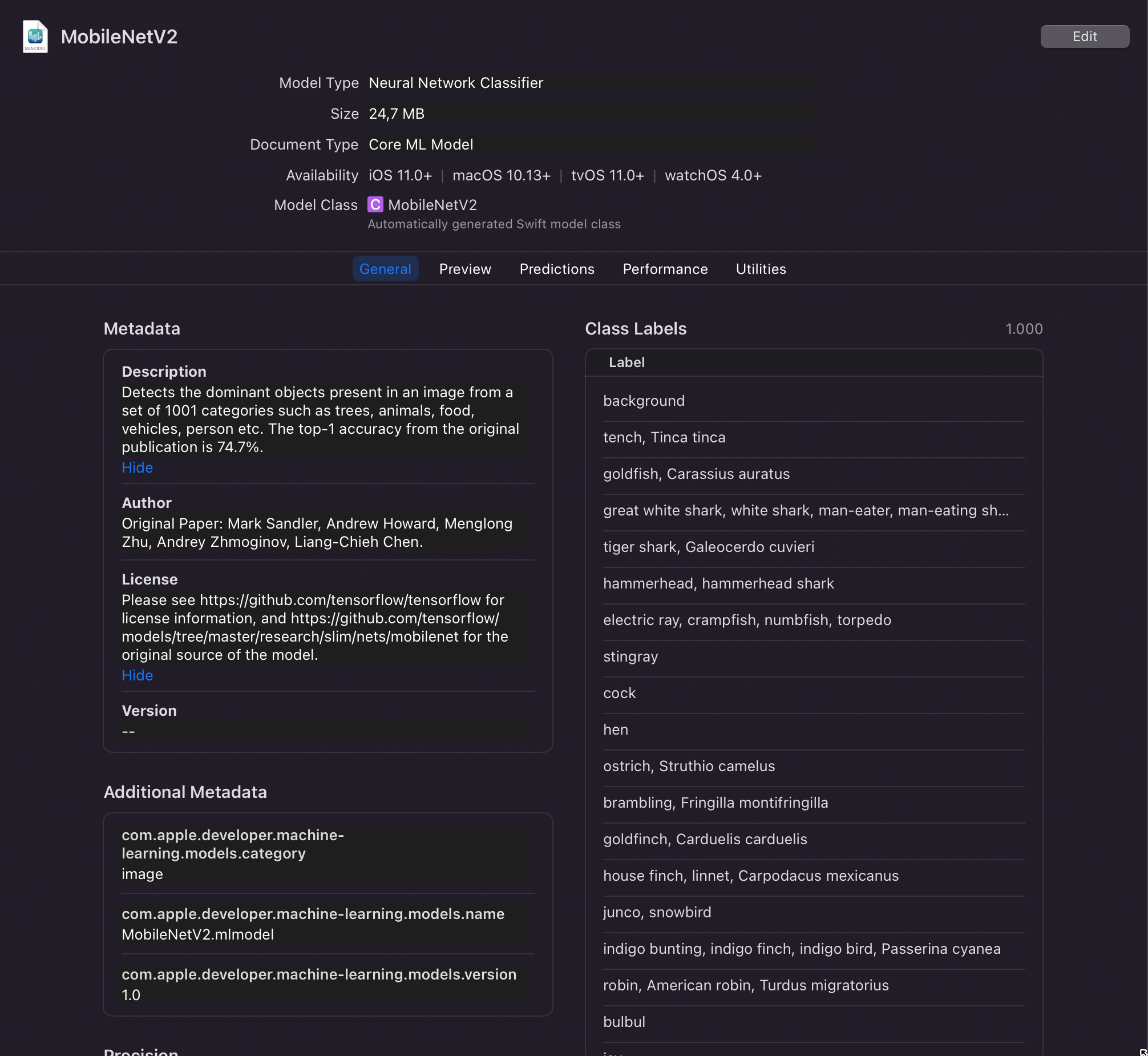 There are several models provided by Apple that we can use here. For this example project, we are using MobileNetV2, but feel free to use different ones.