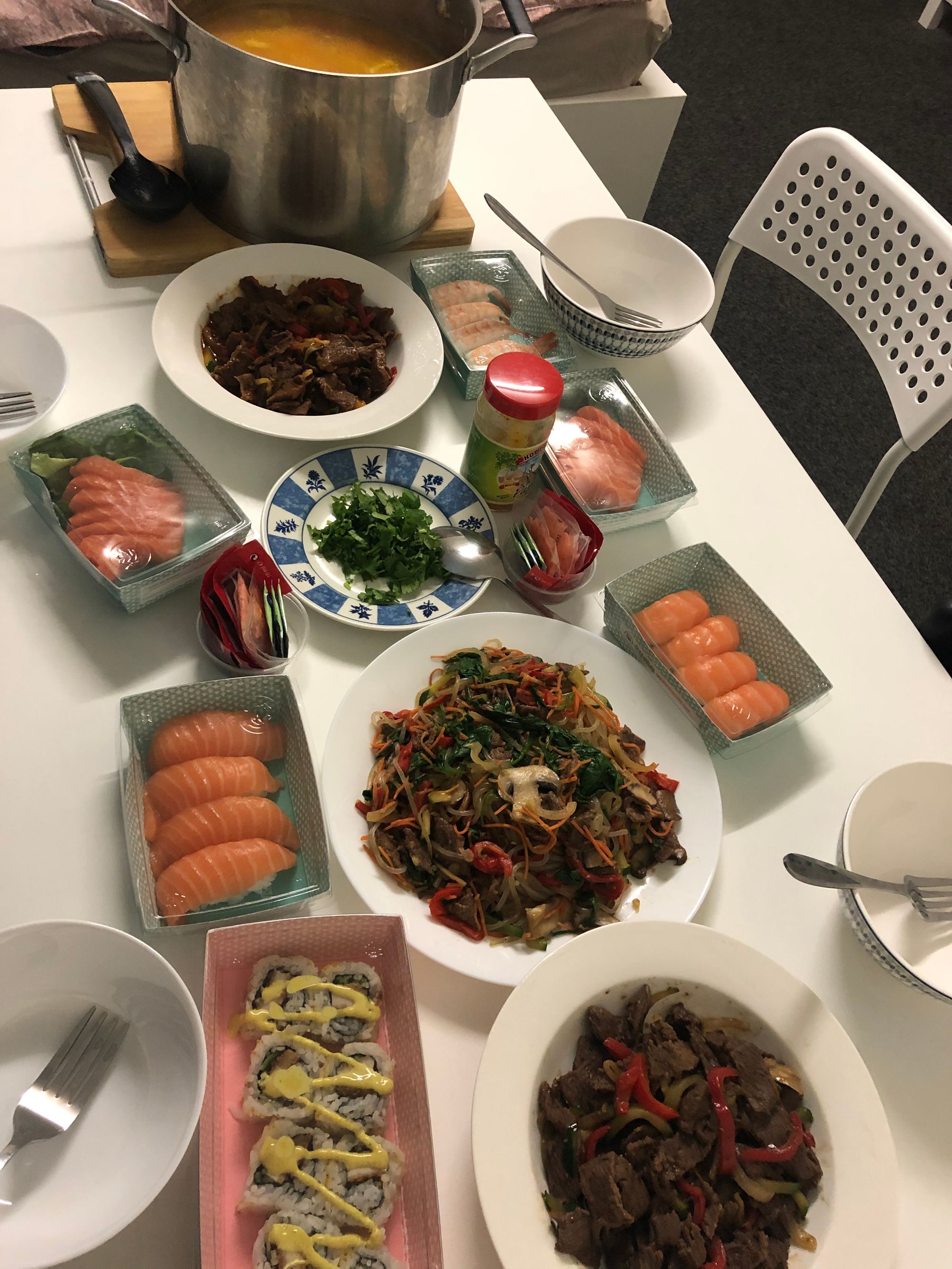 My girlfriend and her sister were making food for us to eat. We had salad, Bulgogi, Sushi, Jap-Chea, and Chicken Soup were the items and it was a great dinner.