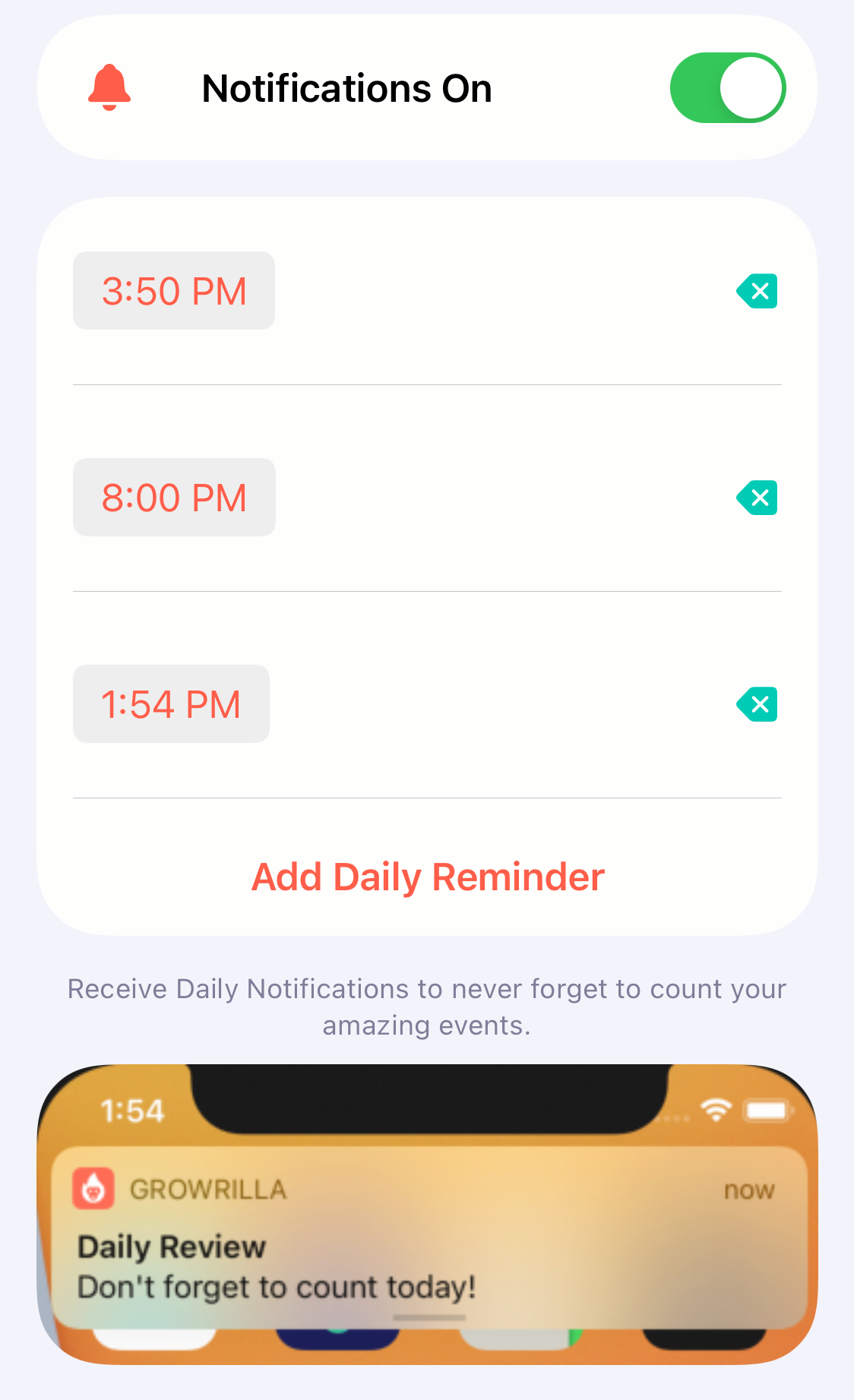 As yesterdays post, this allows the user to set reminders to review all their counts of the day. Users can select choose their own time and the number of times a notification gets sent.